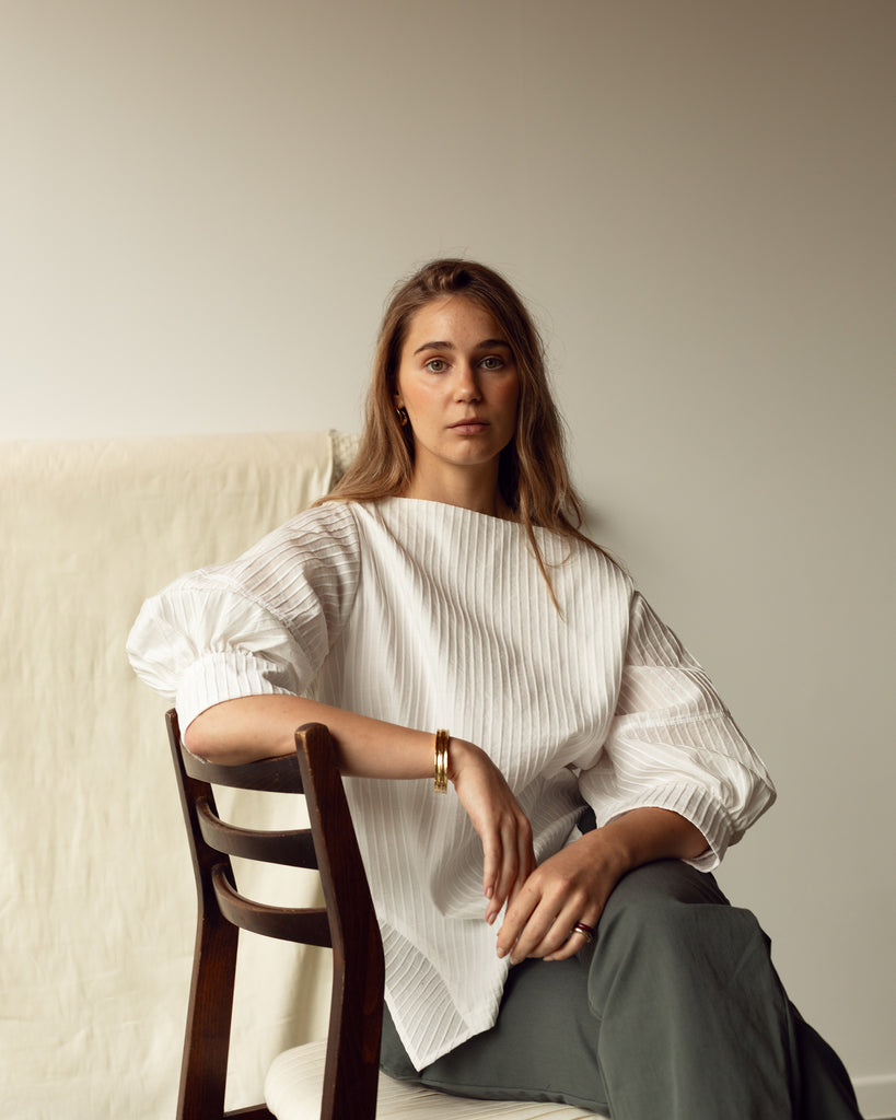 This blouse is crafted from pleated and topstitched Japanese poplin. The textured stripes give the fabric support and elongate the silhouette.