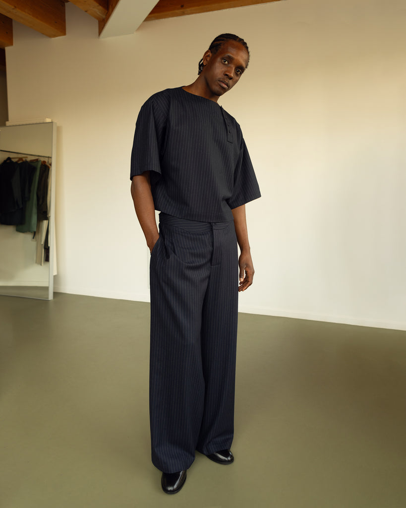 Inspiré des caleçons masculins des années 1930, ce pantalon unisexe revisite une coupe d’époque avant l’apparition des élastiques. Il est monté avec un système de double boutonnage et des pattes de serrage latérales permettant d’ajuster la taille selon la silhouette.