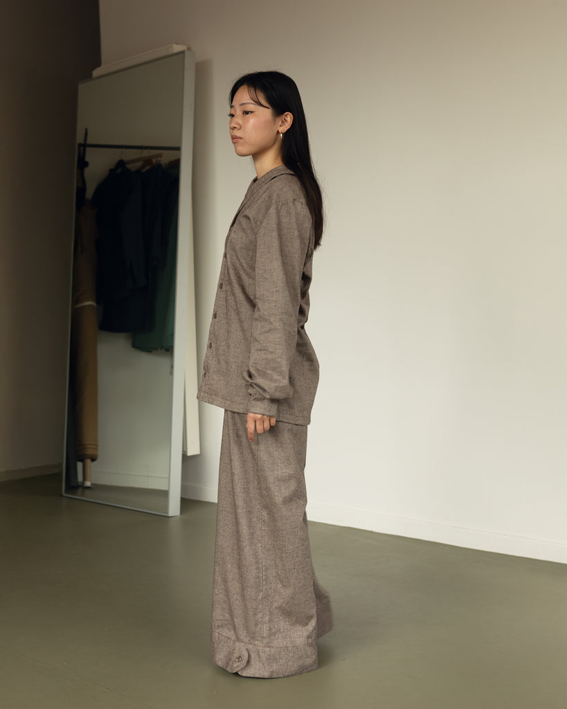 Confectionné dans une flanelle de coton taupe d’une grande douceur, cette étoffe a été choisie pour sa chaleur respirante, son toucher duveteux et sa souplesse naturelle.
