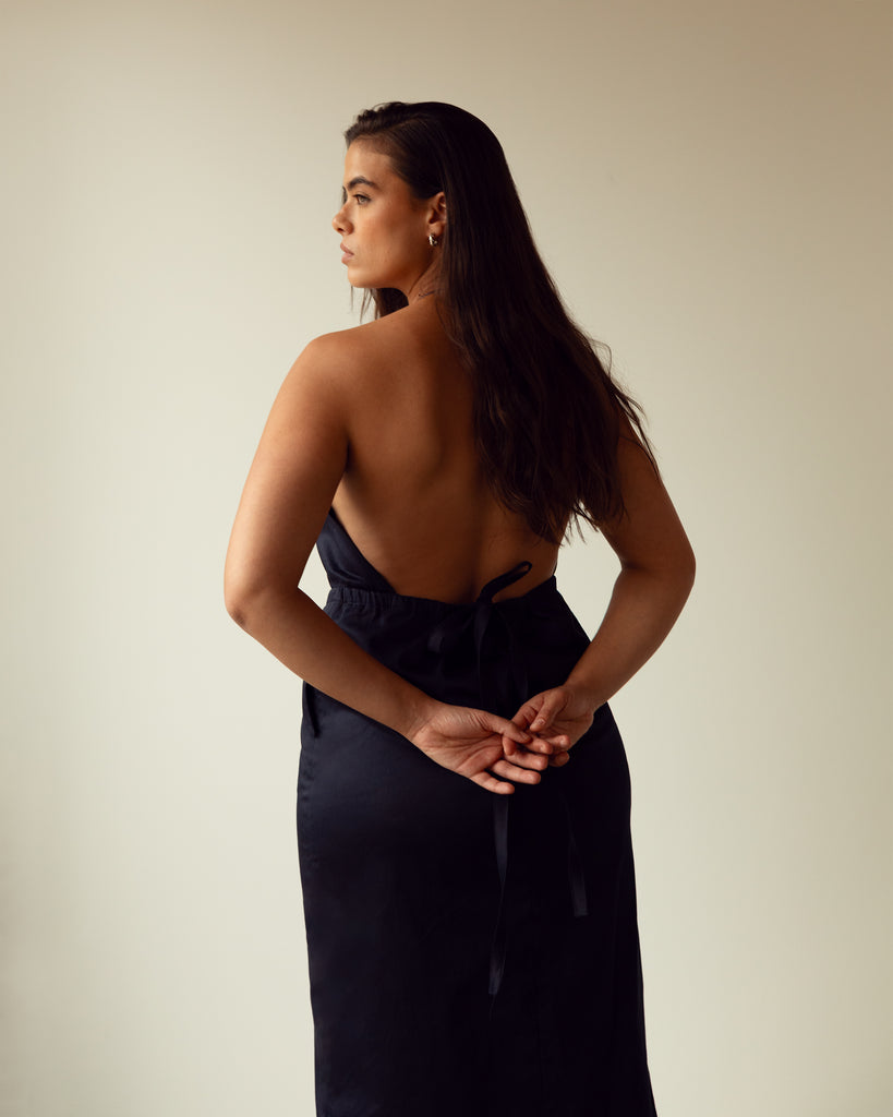 Sa fente avant permet de l’aisance de mouvement. La taille est haute pour structurer la silhouette, et le dos nu apporte de la sensualité.