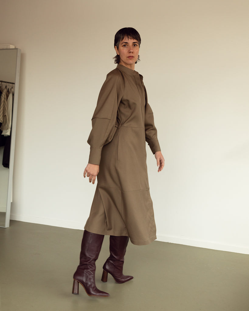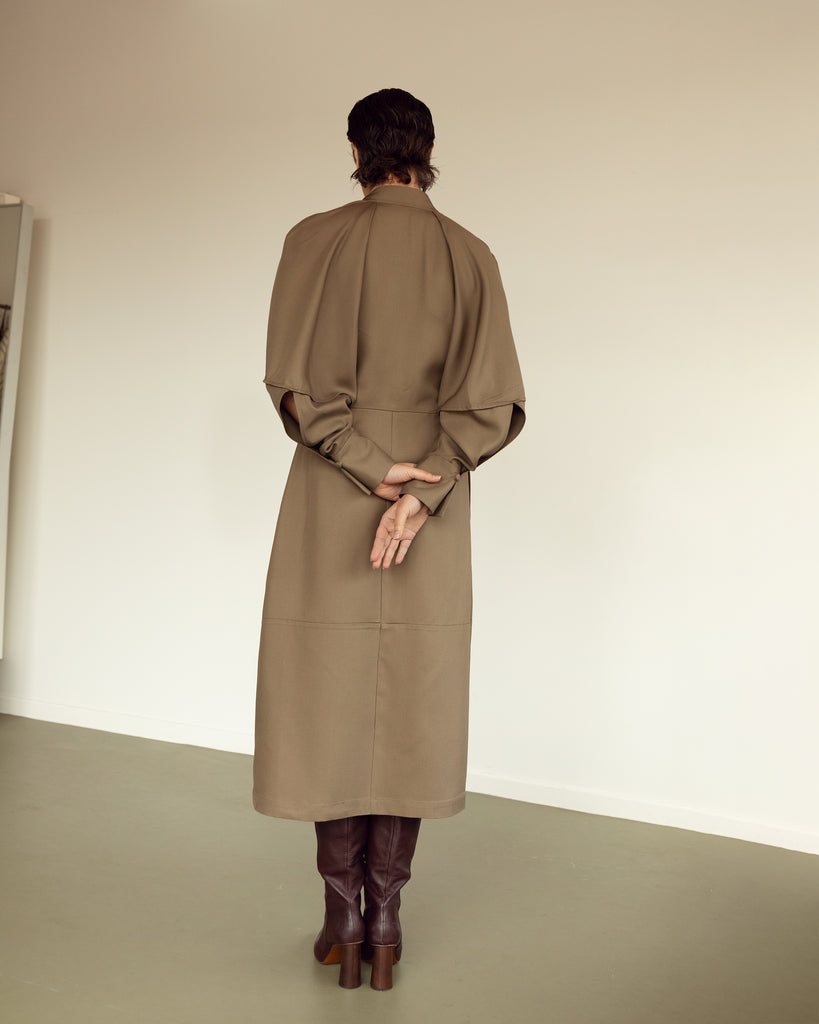 Ses empiècements et son travail de coupe dessine une silhouette avec des volumes équilibrés, accentuée par la taille marquée, les manches raglans et un col fermé.