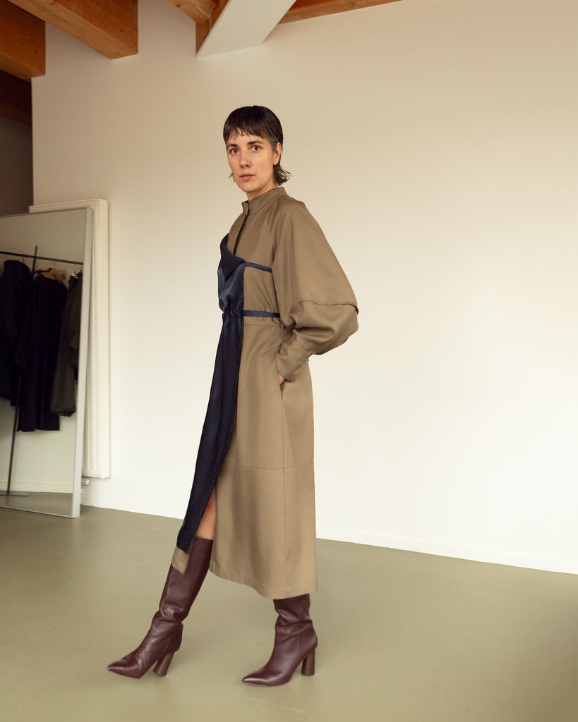 Sa découpe et son asymétrie dessinent la silhouette. Cette pièce forte construit à elle seule un look.