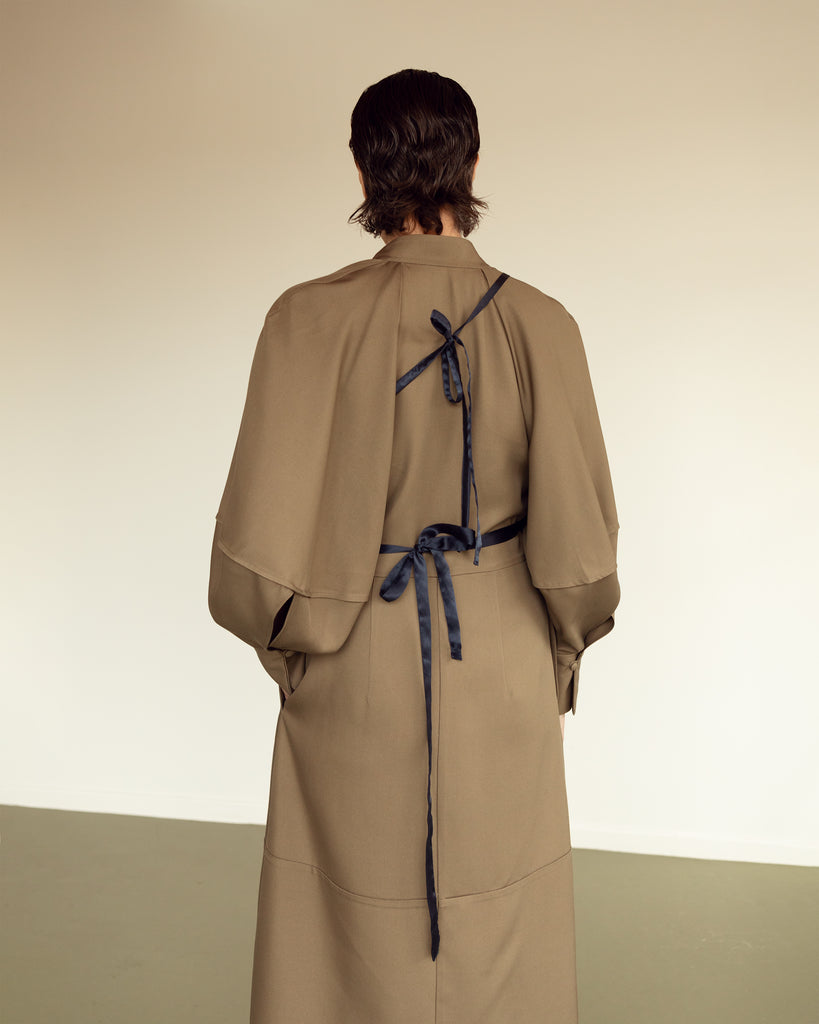 Il est inspiré du milieu travailleur et des artisans, réinterprété tout en contraste avec son satin de soie délicat et lumineux.