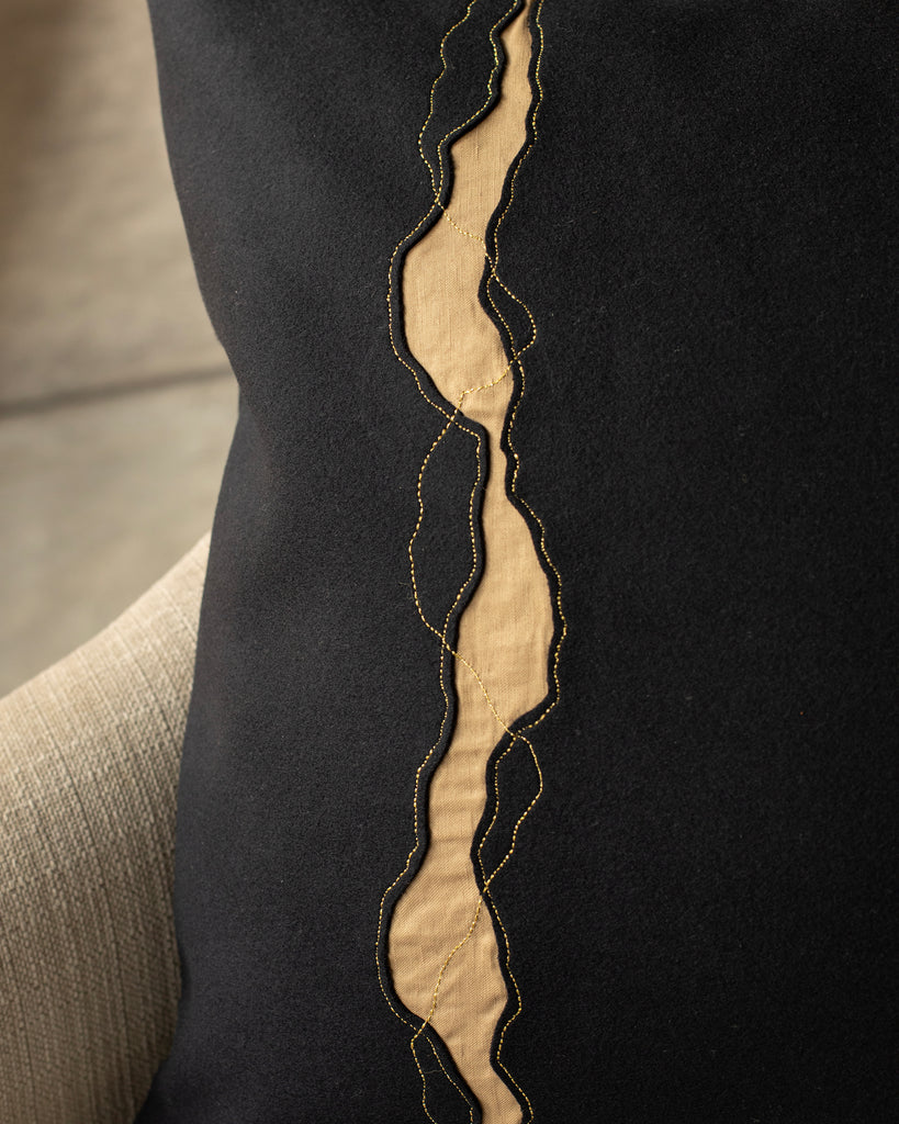Une chute de lin, utilisée dans la collection RIVAGE, a été appliquée et surpiquée au fil doré