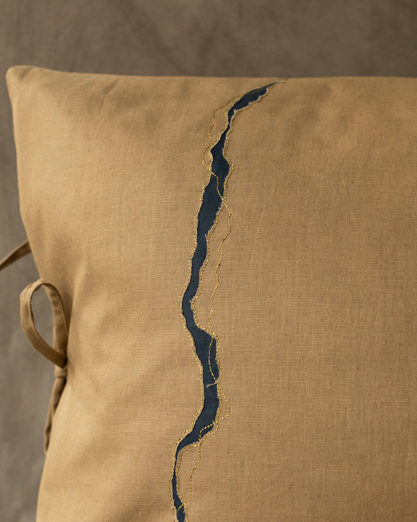 Une chute de lin, couleur de roche, a été conservée après la coupe de la collection RIVAGE. Elle a été redécoupée puis appliquée et surpiquée au fil doré.